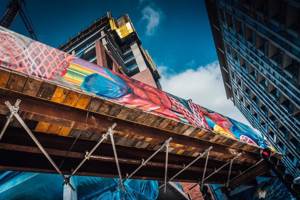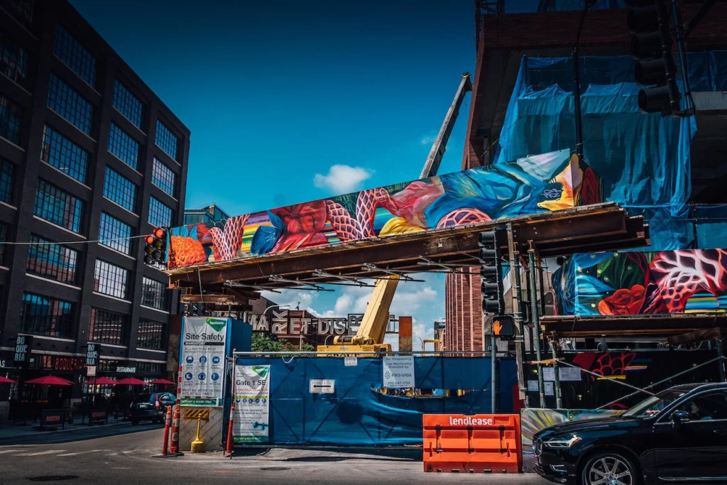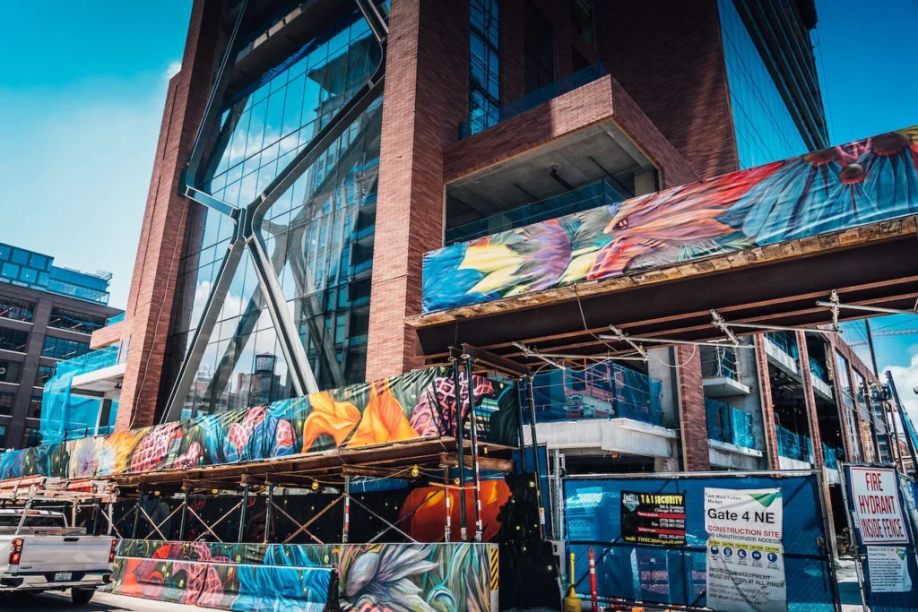 At 800 Fulton, Thor Equities, in partnership with the Cushman & Wakefield leasing team and Torque, has brought bright, playful and panoramic art to the fast-developing construction of the building. Torque worked with Ava Grey design to define a mural program that now sprawls and blooms out across the barricades on the eastern edge of the construction site. The brilliant artistic mind behind the images and paint is Caesar Perez/Czr Prz.