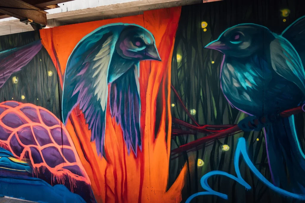 Huge plywood panels covered in gestural birds and explosions of abstract cool span 140 ft of the block. The overhead canopy and cement barricade are also covered in original artwork, all dancing alongside Halsted street traffic. The mural took just under 2 months to complete — Caesar has been working tirelessly in a studio called Mana Contemporary in Pilsen.
