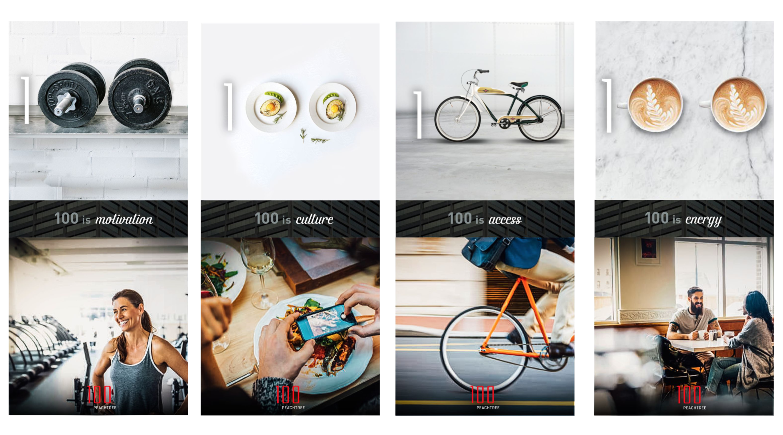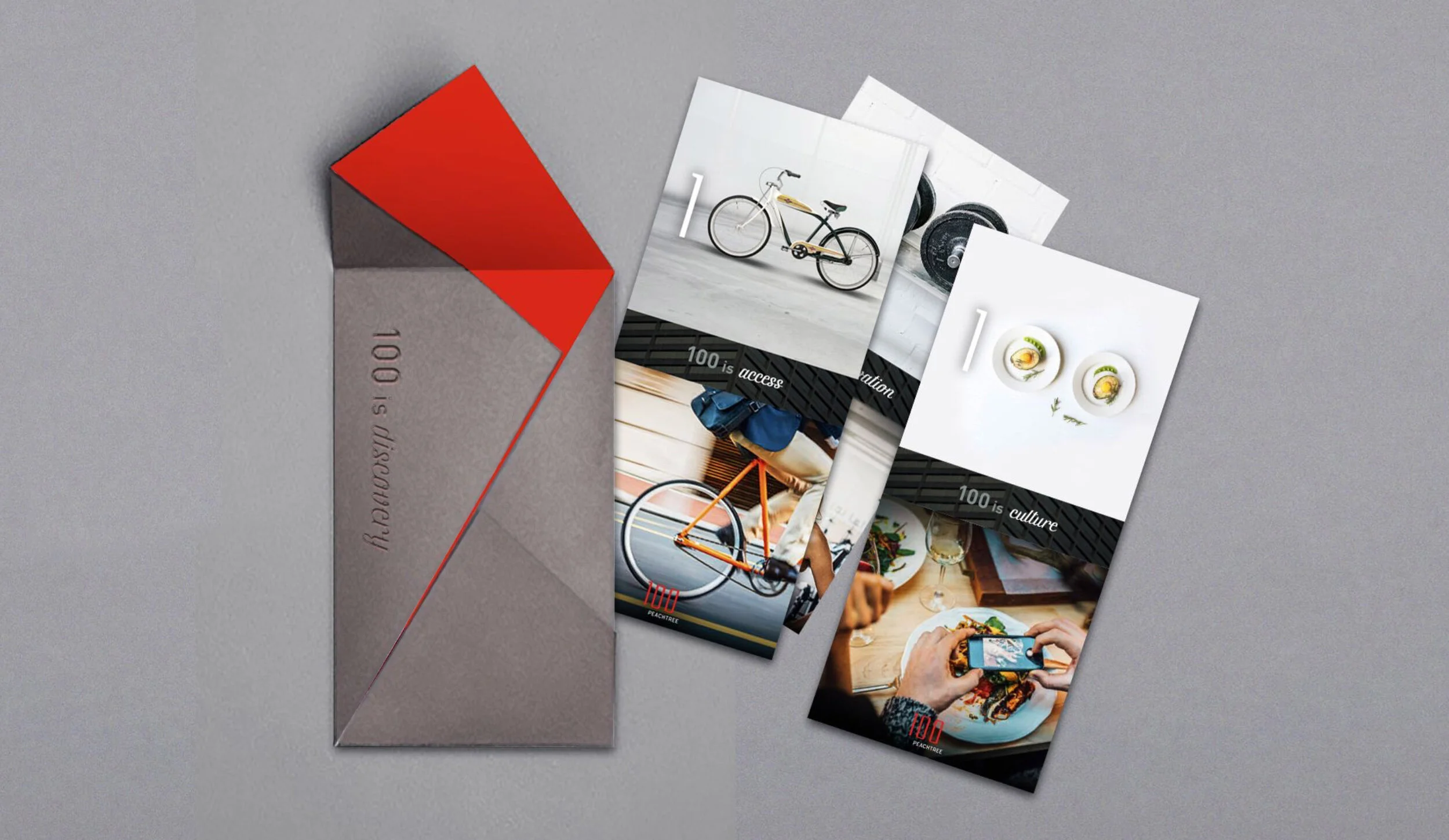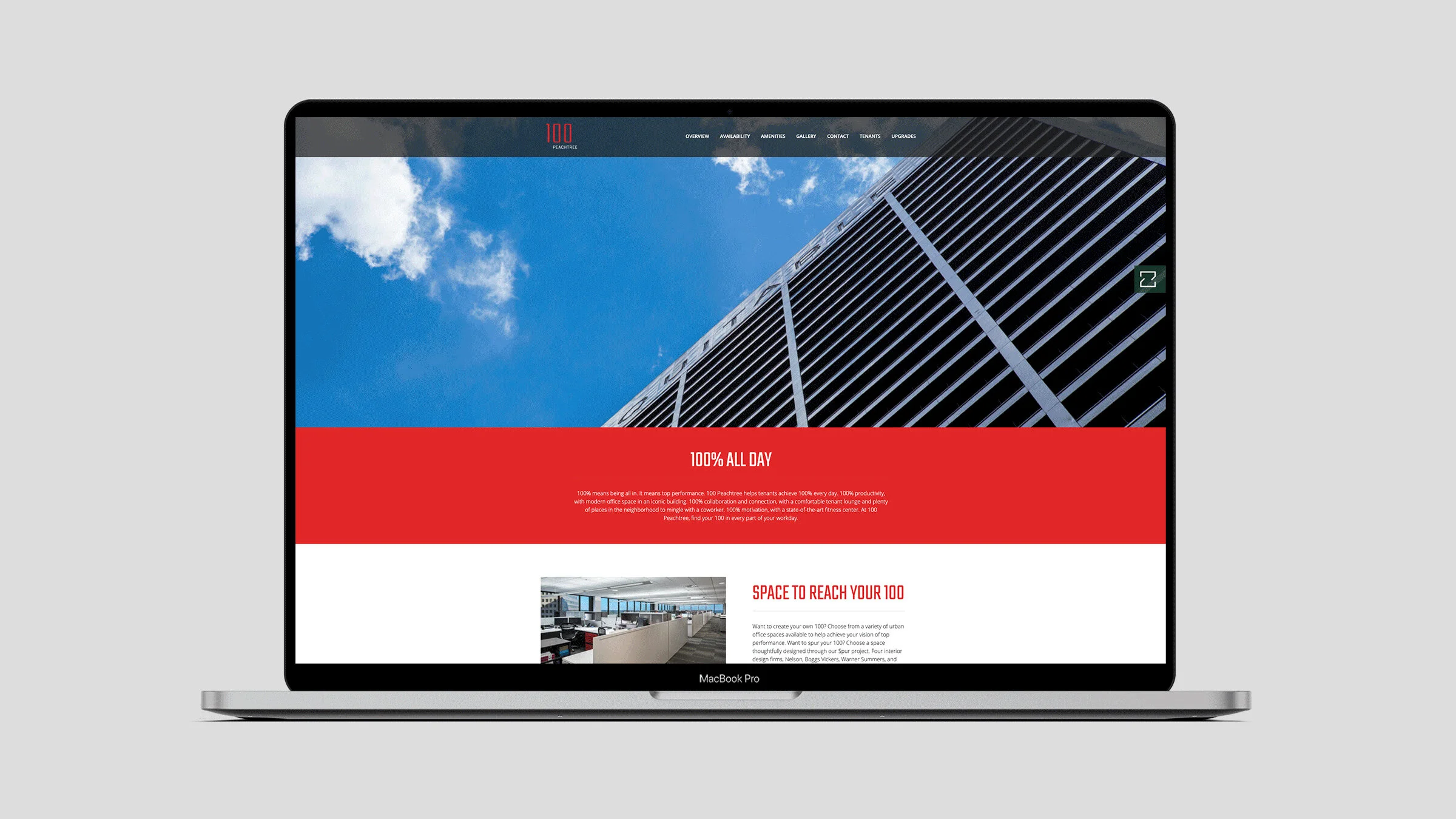 Torque approached the assignment as both a property branding campaign and also part of the movement to bring new vibrancy to Downtown Atlanta. We developed messaging that keyed off of the new name / address –100 Peachtree St.–emphasizing another meaning for 100, as in 100%, an all-in totality. We also developed branding for a spec suite program called Spur, a reference to Atlanta’s railroad history. Other marketing elements included: logo design, brand standards, property website, sales collateral, spec suite signage and a ceiling mural map treatment for the lobby.