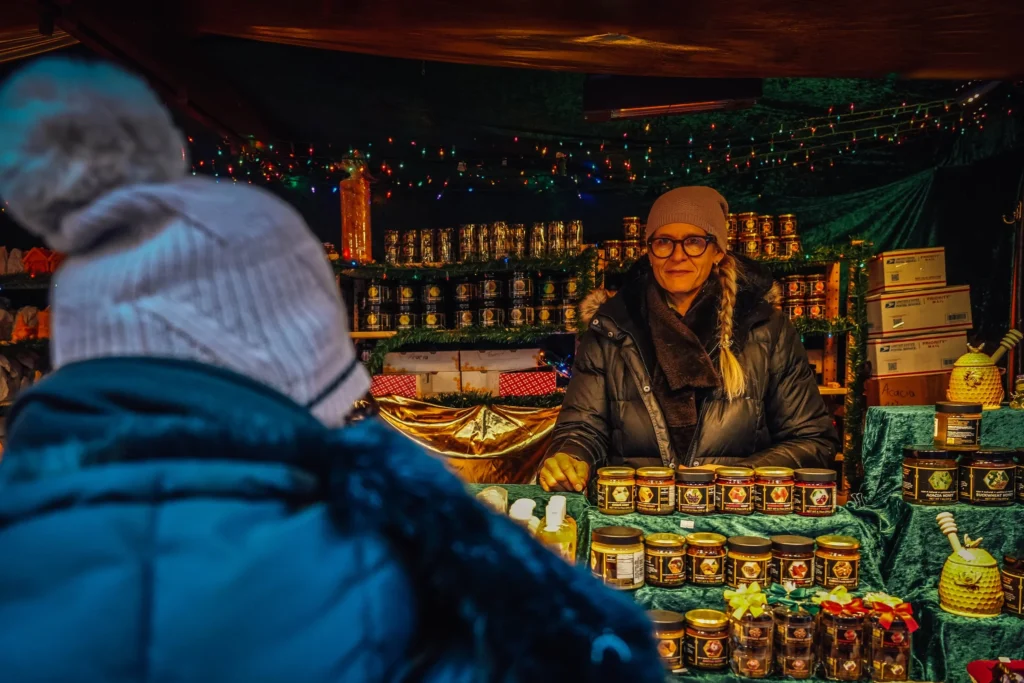 Santa’s house always delights the kids, so don’t pass up a selfie photo-op with Santa and his little helpers. Alternatively, you might be able to introduce them to the real live Christmas Fairy, who looks like she flew down from the top of the tree to mingle for the evening. She is a vision in gold and offers a wealth of knowledge about the market and its origins.