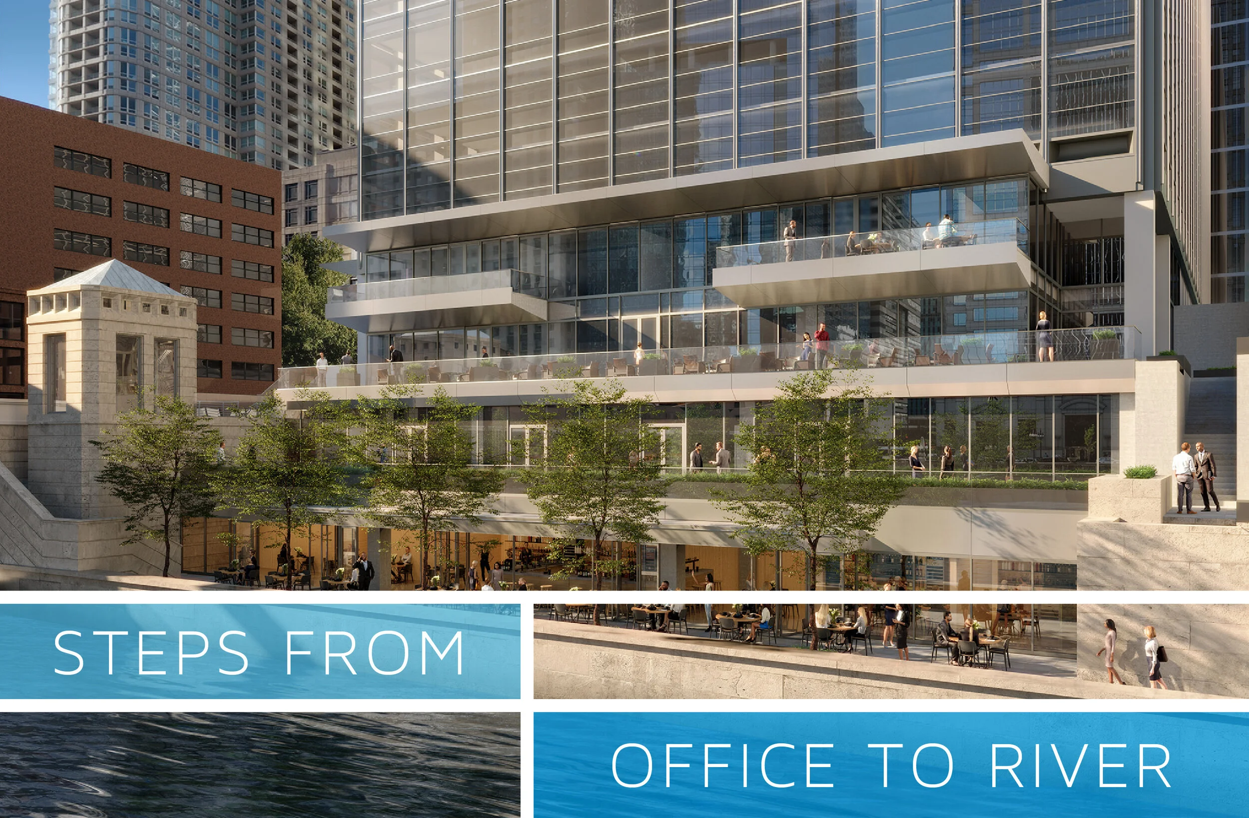 321 N. Clark is consistent with the Hines strategy of repositioning and leveraging properties along the Chicago River. Their approach was to open the building to the river, an about-face from the original orientation, and to place a Lettuce entertainment restaurant at the river’s edge, one of three new restaurants. Other renovations included a lobby refresh and a number of other amenities, all demonstrating that River North is just as desirable as the Chicago Loop CBD.